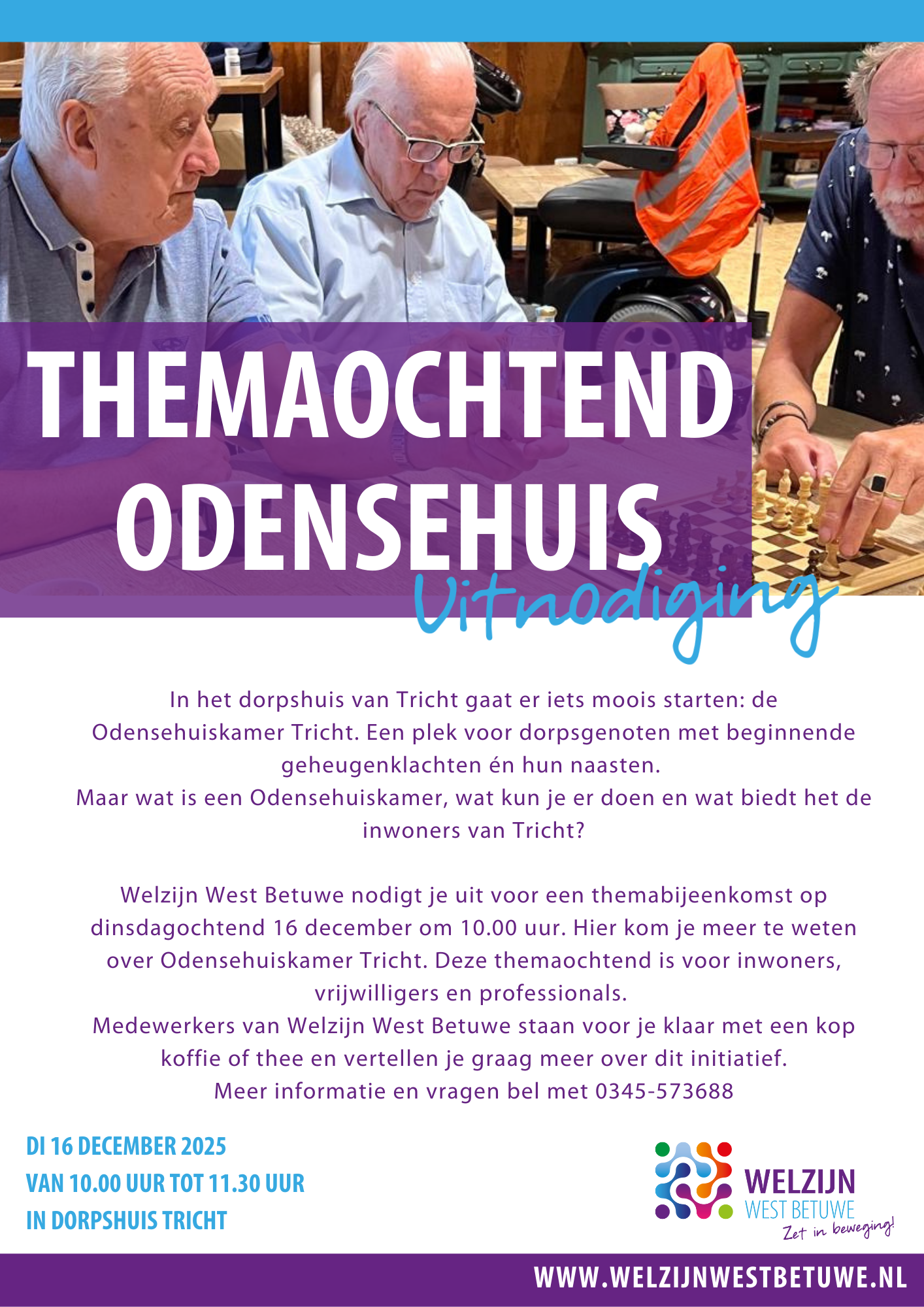 Dinsdagmorgen 16 december, van 10 tot 11.30 uur is er een inloop themaochtend in het Dorpshuis Tricht waar we vertellen wat een Odensehuiskamer is, voor wie het is bedoeld en wat je er kunt doen.